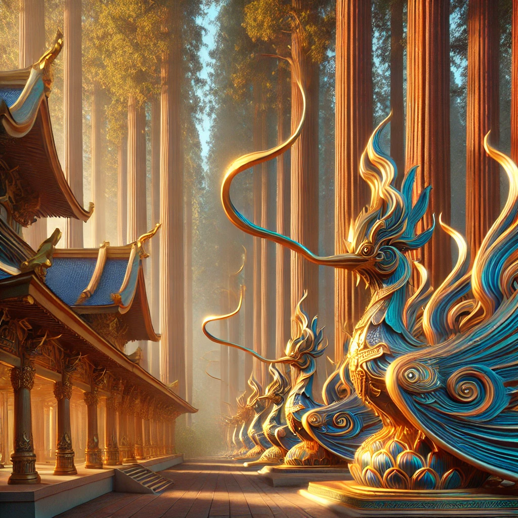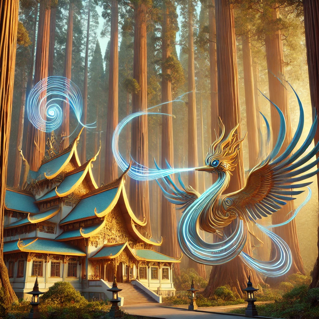 The monastery stood like a living portal, nestled within the embrace of towering redwoods that reached endlessly skyward. It wasn’t just a place—it was a convergence of energy, a meeting ground between dimensions. Scattered across the property and temple were the Garuda Maruda statues, their whimsical forms almost alive with motion. They didn’t resemble conventional birds; instead, they were long, flowing, abstract figures with exaggerated, wavy crests that stretched upward as though connecting earth to sky. Their curves were impossibly fluid, their shapes more like waves of energy than solid beings.