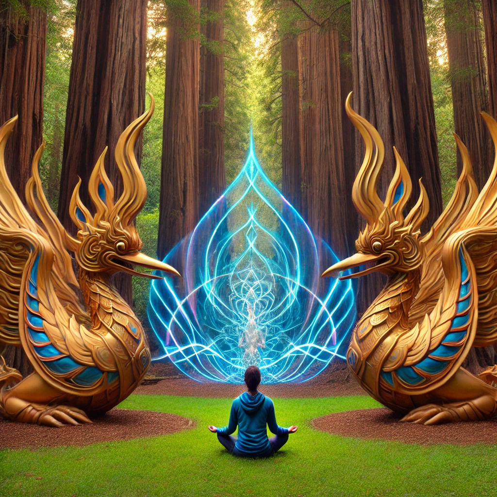 The first time I sat before them, something shifted. It wasn’t immediate—it was subtle, a faint hum in the air that I couldn’t yet name. But as I stared at the statues, their forms began to reveal their purpose. They were more than carvings. They were conduits, anchors for an energetic field that expanded far beyond the physical. Their gold and blue paint glinted in the light, sending subtle pulses upward, intertwining with the energy of the redwoods. Together, they created a latticework, an invisible network of power that connected everything around me.